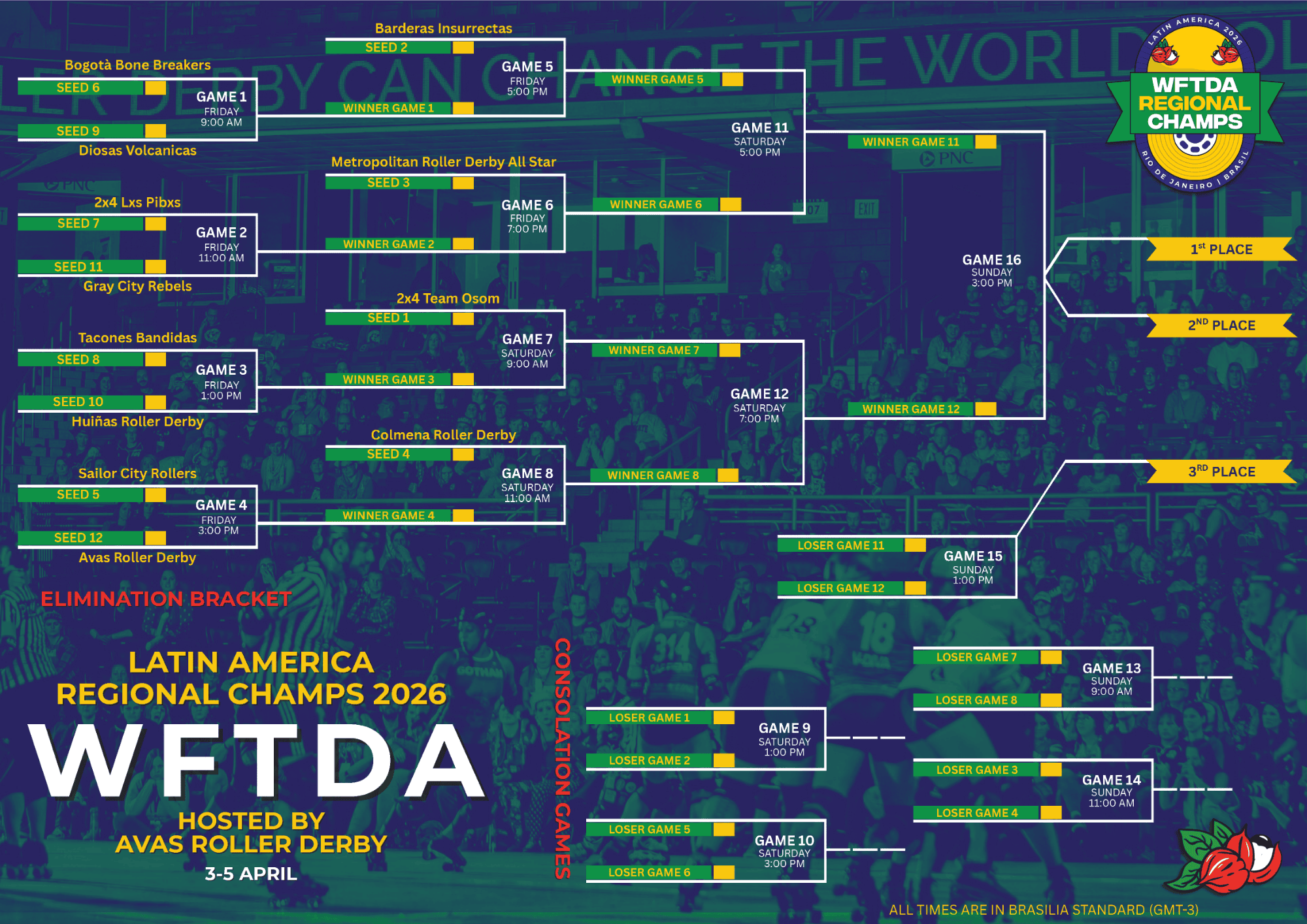 The WFTDA Latin America Championships bracket uses the March 1, 2026 rankings to seed the teams. The regular power seeding bracket led to a number of same-country match-ups in round 1 and 2. This is unfortunate for teams at a regional tournament not to be able to play new opponents, so the panel swapped seeds 6 and 7 and 9 and 10 to prevent match-ups between teams from the same country. The winner of the tournament will be invited to the 2026 WFTDA Championships in Malmö, Sweden.