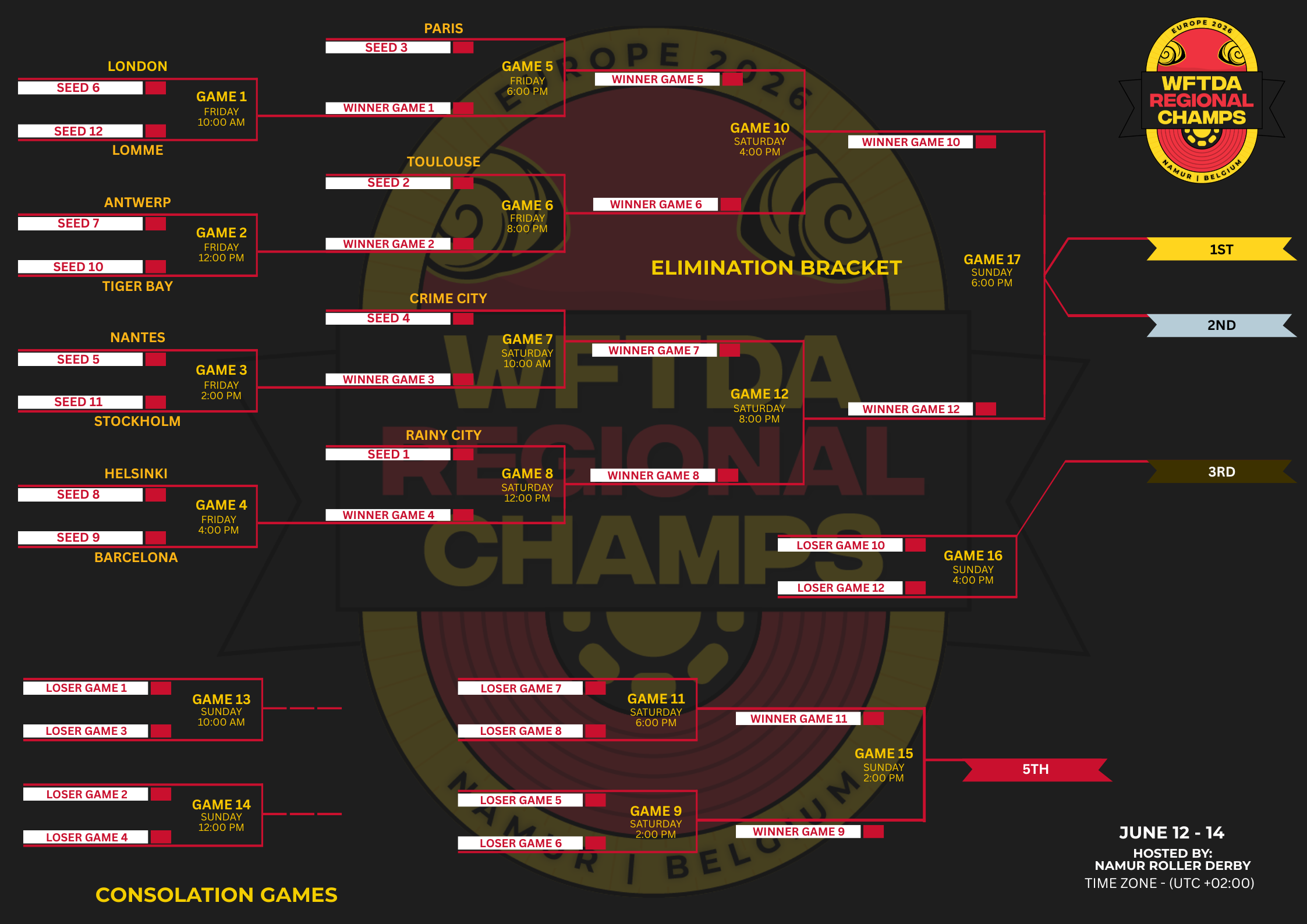 The 2026 WFTDA European Regional Championships will take place in Namur, Belgium, hosted by Namur Roller Derby. This page will give you everything you need to know about the tournament, whether you’ll be attending in person or watching live at home. Information will be added as it becomes available.